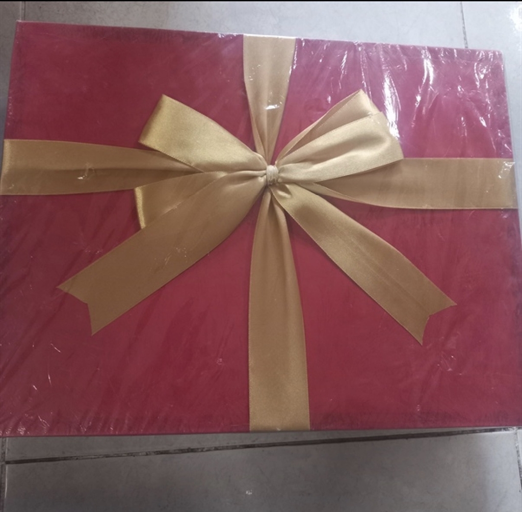 Hộp quà được làm từ giấy cứng, bọc họa tiết hoa và caro nổi bật, kèm nơ ruy băng nổi tạo điểm nhấn.