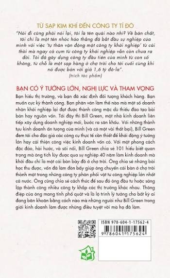 Quyển sách là 101 bài học về triết lý sống và kinh doanh được đúc rút từ cuộc đời của Bill Green, nhà sáng lập và CEO của các công ty Cresta, Lending One và Interline. Chưa từng tốt nghiệp đại học và xuất phát từ nghề bán hàng ngoài chợ trời, rồi một cửa hàng bán lẻ đồ ngũ kim, 20 năm sau, ông đã gầy dựng nên công ty Wilmar-Interline trị giá 630 triệu USD và có 2.300 nhân viên, có 60 trung tâm phân phối khắp Mỹ, Canada và Puerto Rico. Nhưng ông không dừng lại ở đó... Những bài học ông đúc rút từ những trải nghiệm thực tế, thậm chí là kinh nghiệm xương máu, mặc dù có vẻ đơn giản, nhưng chứa đựng triết lý sống. Tính hiệu quả của chúng dĩ nhiên đã được minh chứng bằng thành công của ông. Người đọc sẽ vừa cười vừa gật gù trong lúc nghiền ngẫm những bài học sáng tạo mà không có lớp học truyền thống nào dạy được. Và những bài học này dễ áp dụng đối với bất kỳ ai, đặc biệt là những người có ý định khởi nghiệp và các doanh nhân khởi nghiệp mới nổi. Đầy sức thuyết phục và hoàn hảo dành cho bất kỳ doanh nhân thông thái nào đang muốn phát triển kinh doanh.