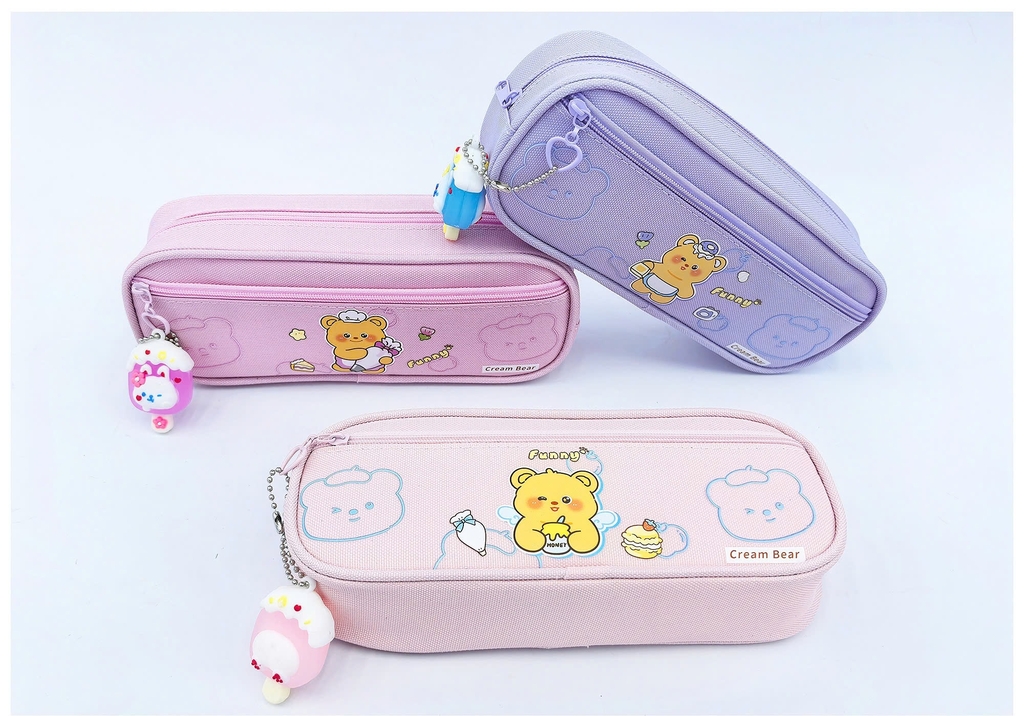 - Thiết kế & Tính năng: Túi có thiết kế pastel với hình in gấu và thỏ (Cream Bear), đi kèm với một móc khóa hình kem xinh xắn. Sản phẩm thường được chia làm nhiều ngăn giúp phân loại bút và dụng cụ học tập khoa học.
