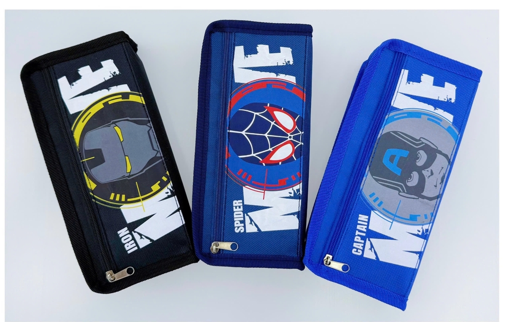Trong hình ảnh là một chiếc hộp bút vải (bóp viết) dành cho học sinh với thiết kế lấy cảm hứng từ nhân vật của Marvel.