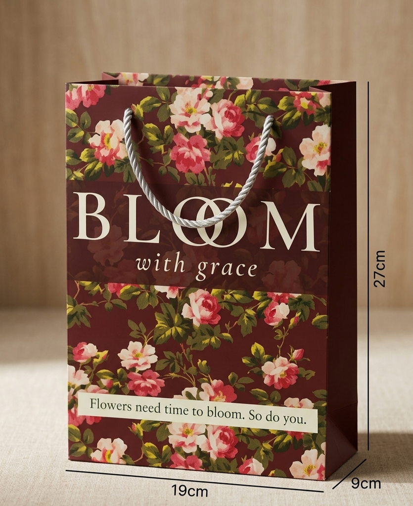 Ở chính giữa túi có dòng chữ “BLOOM with grace” được in nổi bật, mang ý nghĩa về sự phát triển và tỏa sáng một cách nhẹ nhàng. Bên dưới là câu “Flowers need time to bloom. So do you.”, một thông điệp mang tính động viên và truyền cảm hứng, nhắc rằng mọi sự trưởng thành đều cần thời gian.