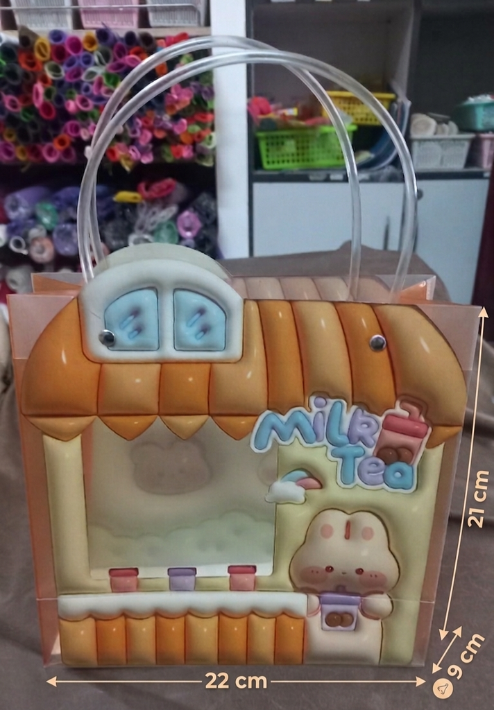 Họa tiết trung tâm: Dòng chữ "Milk Tea" được tạo hình nổi mềm mại với tông màu xanh dương và tím pastel. Ngay bên dưới là một chú thỏ trắng dễ thương đang ôm một ly trà sữa trân châu.