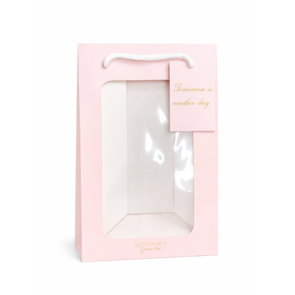 Đây là mẫu túi giấy mặt kính (hay còn gọi là túi giấy có cửa sổ mica) màu hồng, thường được dùng để đựng quà tặng, hoa, gấu bông hoặc mỹ phẩm